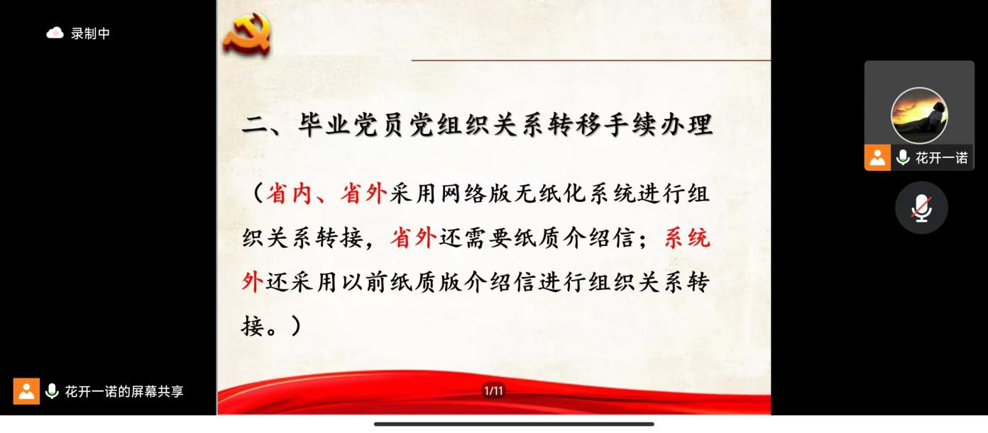 首先,王老师为大家详细讲解了毕业生党员组织关系转接的主要流程和注意事项,提醒毕业生党员要重视党组织关系转接工作,做到及时沟通、及时反馈,确保高效完成组织关系转接事宜。同时,王老师针对毕业生们提出的疑惑也进行了细致解答。最后,王老师对毕业生党员们提出三点希望:一是牢记党员身份,不忘初心,不断前行;二是不断加强理论学习,增强党性修养;三是要做实干家和行动者,在未来的工作学习中不断做出新成绩,贡献新力量,展现新作为,继续发挥党员的先锋模范作用。