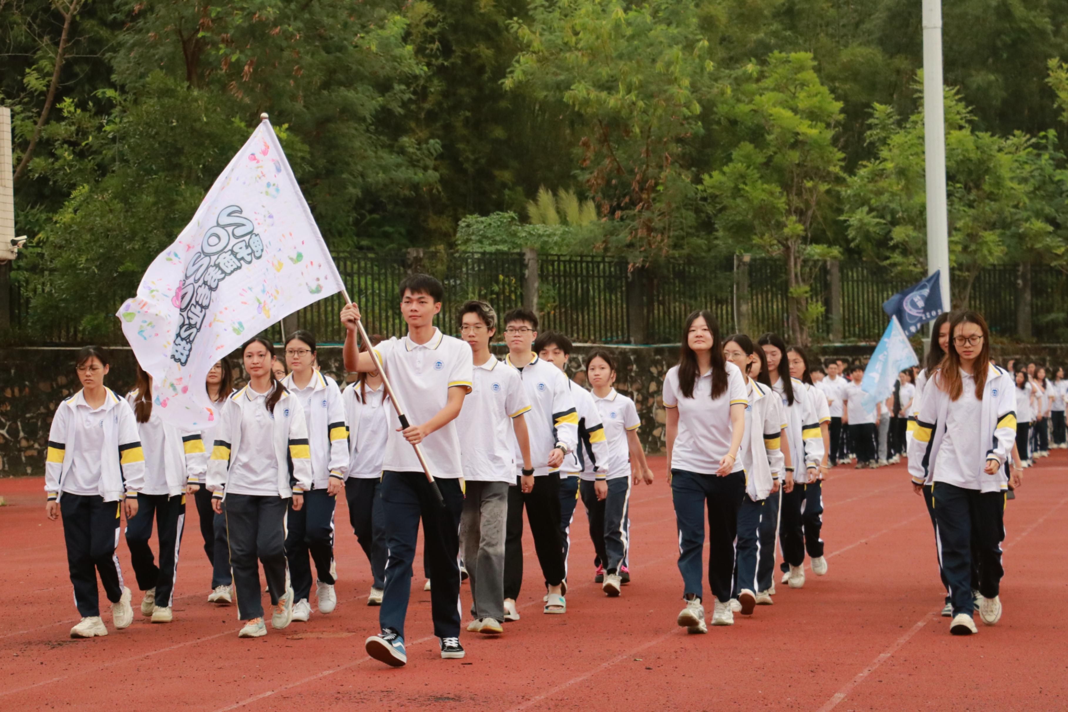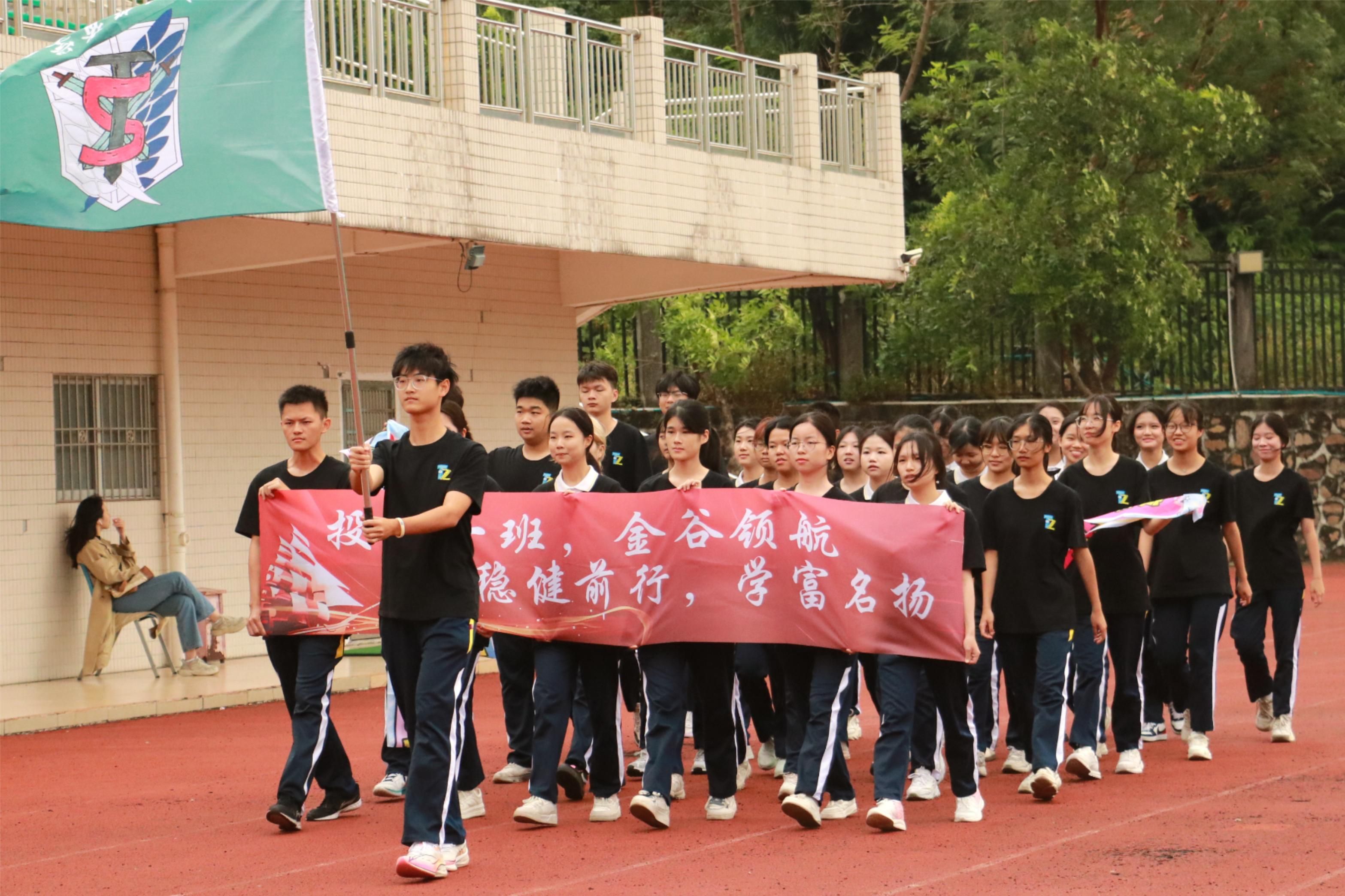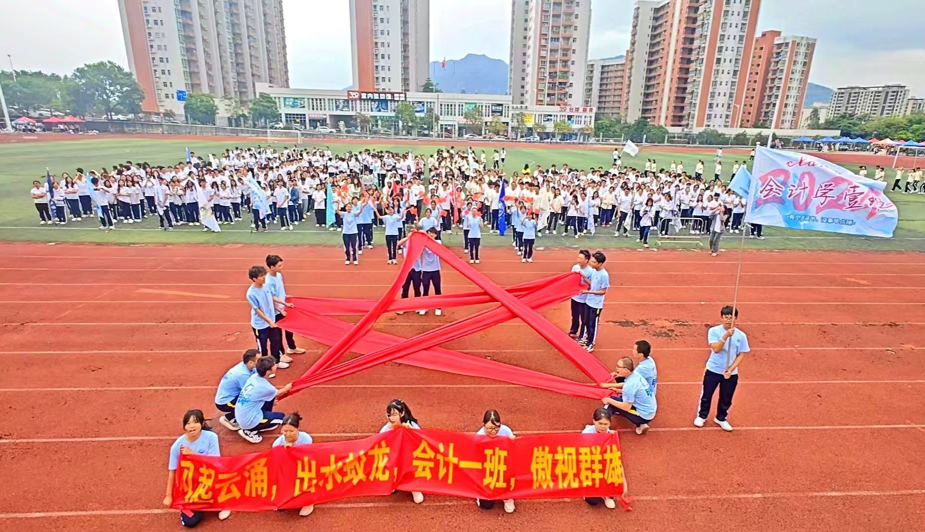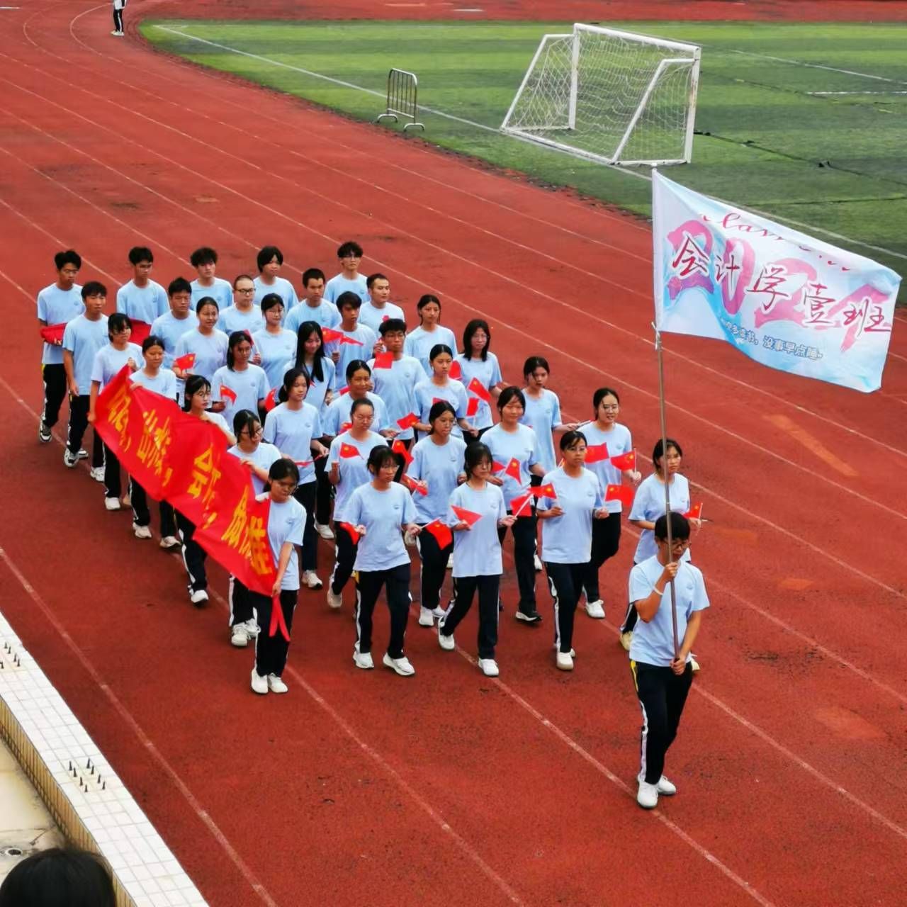 入场式上, 30名旗手高举旗帜,带领班级同学昂首阔步走向主席台。行进中,来自不同班级的团体方阵各出新意、各展风采,用响亮的口号与精心设计的表演表达着对这场体育盛会的期待与热爱。2024级会计学1班的同学们英姿勃发,走到主席台中变换队形,将红色彩带拉出大型五角星,并喊出“风起云涌,出水蛟龙,会计一班,傲视群雄”的口号;还有多个班级整齐划一,高举班旗、高喊班级口号。
