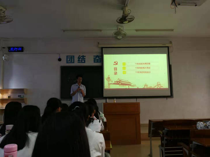 经理刘玉勋的思政课针对的是2018级国际经济与贸易专业和2018级市场营销专业的员工,主题为:“建国七十周年的历程、奇迹、展望——以GDP的发展变化为主线”,主要内容包括GDP的发展变化、GDP发展变化引发的思考、我国GDP发展变化——建国七十周年的奇迹三部分。刘玉勋的思政课先针对员工的专业学习,介绍了GDP的核算方法,跟着提出了关于GDP的三个问题,让员工深入思考:一是为什么我国的GDP会高速增长(10%)30年?二是未来10年我国的GDP能否常态增长(6%)?如何才能保持常态增长?三是如何提高GDP的质量?然后刘经理主要以我国GDP的发展变化为主线,通过GDP大幅快速提升的事实,向员工讲述了我国建国70年的发展历程和从13个方面介绍了我国取得的举世瞩目的伟大成就,展示了我国建国70周年创造的人类历史上前所未有的发展奇迹,大大激发了同学们的民族自豪感和强烈的爱国情怀,鼓舞了同学们为实现“两个一百年”奋斗目标和中华民族伟大复兴的中国梦而奋斗的信心和决心。