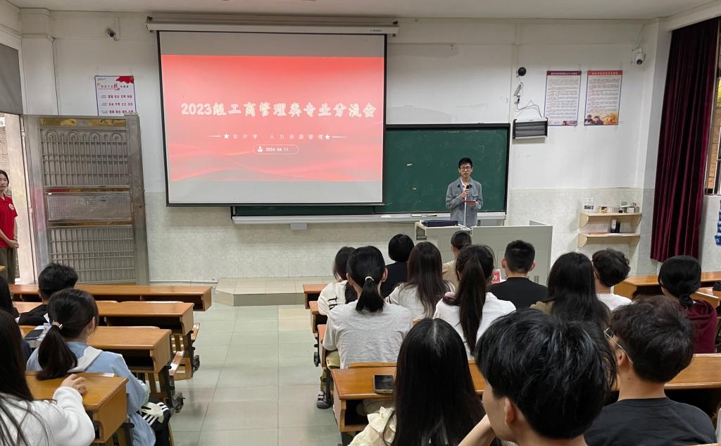 李力在专业分流前详细介绍了分流的规则和流程。工商管理类专业96名员工按照“23-24学年第一学期平均学分绩”排名顺序依次选择自己的意向专业。
