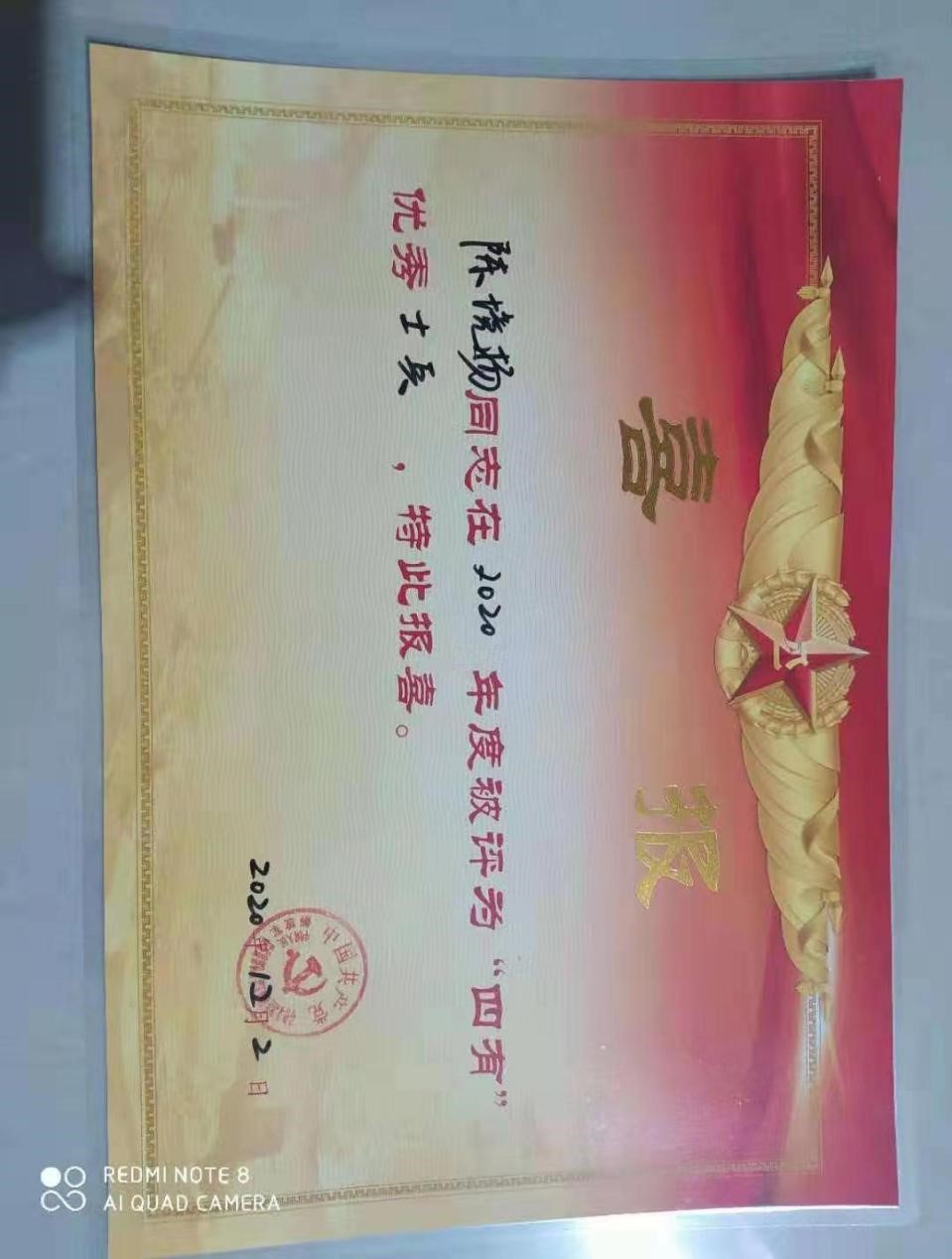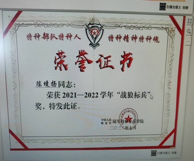 自入伍以来,陈境扬同志始终坚定理想理念,认真学习政治理论知识,不断提高党性修养和政治理论水平;始终发扬“挤”和“钻”的精神,摸爬滚打苦训练,练强“胜战”本领;始终以最高标准要求自己,立足岗位,扎根基层,情系官兵,率先垂范,坚持到一线。在一线,陈境扬把全部心思和精力投入到单位建设中去,真正把单位当家建。期间个人先后获得“全优兵”、“军事训练尖子”、“四有”优秀士兵、“四有”优秀学员、海军陆战队“优秀学员”、“战狼标兵”等荣誉,从战士到干部,如今身份转变,但初心不改。陈境扬谨记“使命忧思”,坚信以“狭路相逢勇者胜”的信念,以“咬定青山不放松”的品质,以“职责大于一切”的使命,奋力为强军事业贡献自己的一份力量。